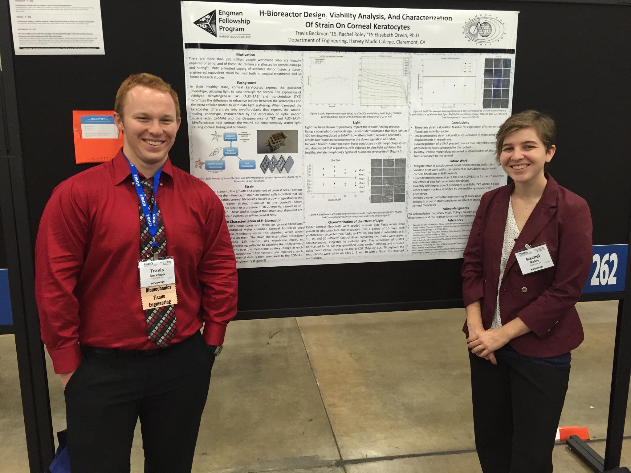 From October 22nd through 25th, seniors Cindy Angpraseuth, Jennifer Zheng, Risa Egerter, Rachel Roley, and local high schooler Kavi Curlin traveled to San Antonio, Texas for the 2014 Biomedical Engineering Society Conference. “It was one of the most formative career experiences for me,” says Travis, “and I’m very thankful that I’m in a school and a lab that allows me to have these kinds of experiences.” The students had the opportunity to network with industry professionals, professors from graduate schools they are applying to, and even Mudd alumni, some of whom are alums of the lab itself. “We’ve built an ‘army’ of people doing cool things in biomedical engineering,” laughs Prof. Orwin, describing her growing group of former lab members. With the interesting techniques of the cornea team and the culturing of astrocytes for gels by the brain patch team, Risa concludes, “Overall, I would say [the research] was well received. The moderator for the poster session even came by and congratulated us on being there!” In the end, the conference proved to be a beneficial experience for the students, the lab, and their research.