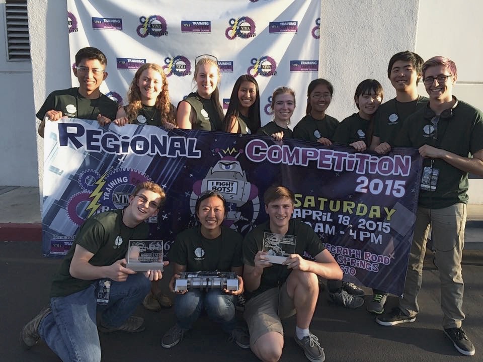 On April 18th, twelve members attended the NTMA Robotics League Regional Competition. The league was started two years ago by the NTMA Training Center in Santa Fe Springs, CA, and is open to any team local to Southern California. The competition includes double elimination matches, as well as a robot rumble where any functioning robot was allowed to fight in the arena. Lilypad experienced technical difficulties during the first match, but took some noticeable chunks off its opponent in the second match, causing sparks and sounds of grinding metal. However, the team’s golden bot was truly able to shine in the robot rumble. Pinning its opponents into the arena walls and sending parts flying, Lilypad won the rumble by the judges’ and audience’s decision, earning the title “King of the Ring.” The team was also awarded “Best Engineering Documentation” for the submission of the team’s CAD models and overall design process.