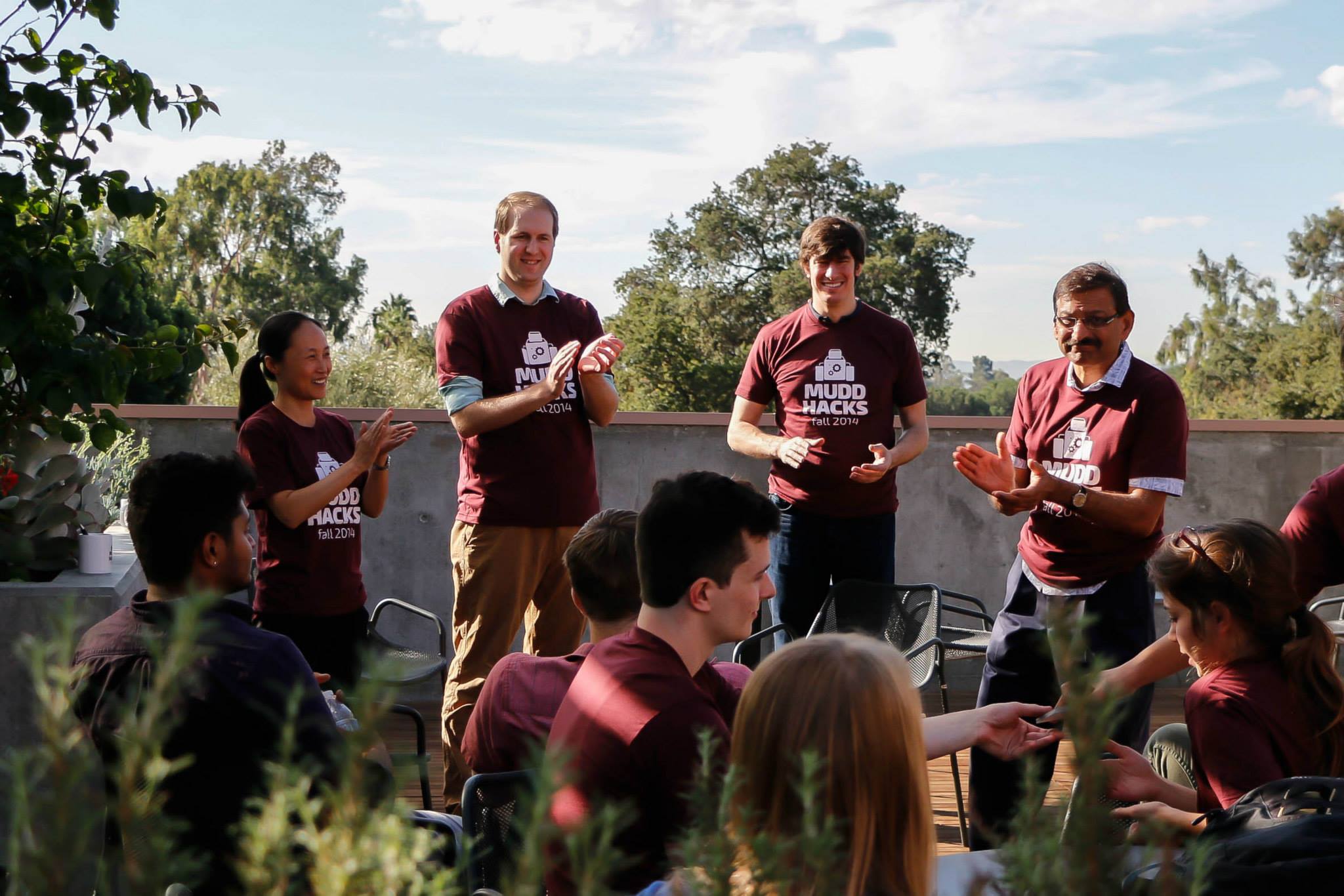 As the sun finally peaked over the horizon, teams reconvened on the third-floor patio to receive shirts and information about judging. The four judges were all Mudd engineering professors: Prof. Kash Gokli, Prof. Qinmin Yang, Prof. Matthew Spencer, and Prof. Josef Spiut. Splitting into teams of two, the professors walked around to each team to evaluate their projects. Students also walked around to see what their peers had hacked during the night.