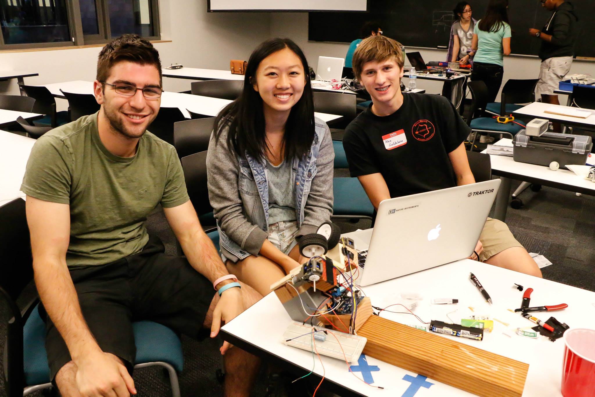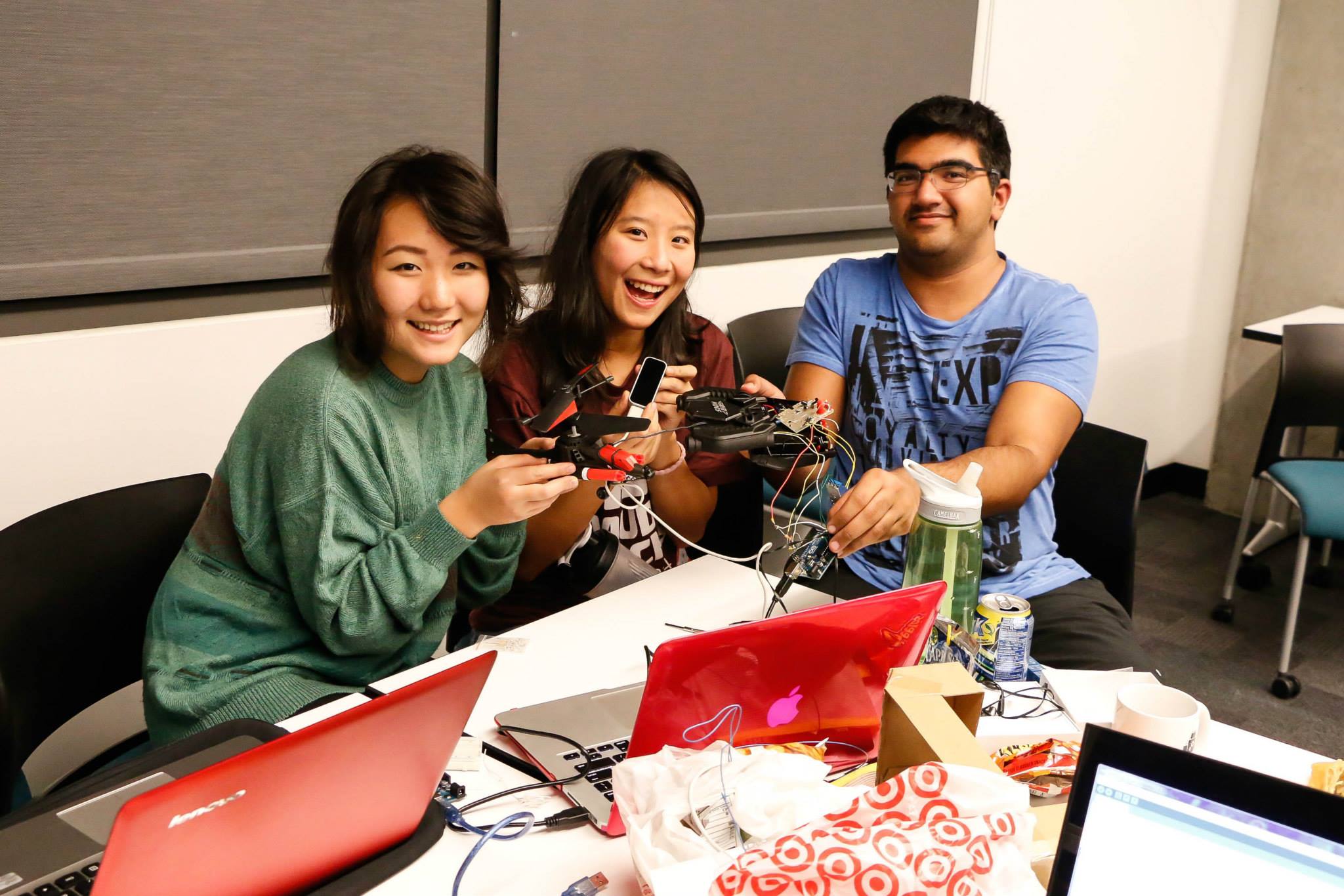 To conclude the hackathon, the judges presented awards to teams with the highest scores. First place was awarded to a team that designed a leap motion controlled helicopter (Erin Paeng, Shaan Gareeb, Cherie Ho), second place to a breathalyzer that opened a box (Paul Jolly, Eddie Gonzales, Adam Schiller, Kunal Menda), and third place to a ping-pong ball launcher (Alex Goldstein, Jacob Rosalsky, Alex Trudeau, Jane Wu). Honorable mentions were also presented a workout button (Max Waugaman, Sean O’Keeffe), a party button (Zach Vickland, Matt Espy, Demetri Monovoukas, Vanessa Ronan), a plasma speaker (Marc Finzi, Aaron Wang, Reed Haubenstock, Sam Dietrich), and a parallel-parking robot (Varsha Kishore, Richard Liu, Daipeng Yang).