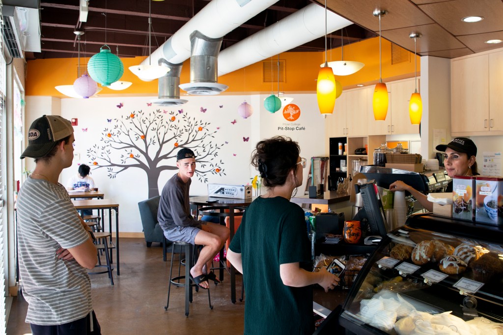 Pitzer’s Pit-Stop Café provides a small but cozy environment for grabbing a quick refreshment amid the stresses of college life. The café offers coffee, espresso drinks, gourmet sandwiches, wraps, salads, fruit cups, juice, chips, and freshly baked pastries. The décor inside is not too complicated, but the walls contain enough orange to provide a distinct sense of Pitzer inside. Outdoors, many tables surround the café, giving customers plenty of room to decompress while enjoying the fresh air. The tables are scattered among walkways so chances are high that a best friend just leaving class will pass by.