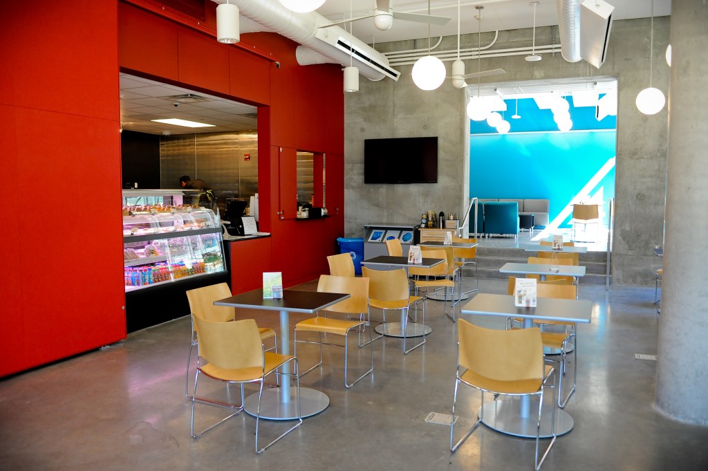 Located on the first floor of the big Shanahan building at Harvey Mudd College, the Shanahan Café effectively functions as a two-story on-campus Starbucks. It has bagels, fruit juices, granola bars, and a wide array of coffees to choose from. The Café often features music at just the right volume, loud enough to catch a rhythm but quiet enough to allow for long conversations. While the playlist of songs at the Café may sometimes feel too small, it still helps provide additional energy for those who rely on the café for a bagel or coffee before class in the morning. The décor is not overly complicated, but its uniformity of red in the walls and couches in the lower level and blue in the walls and couches in the upper level confers a sharp contrast.