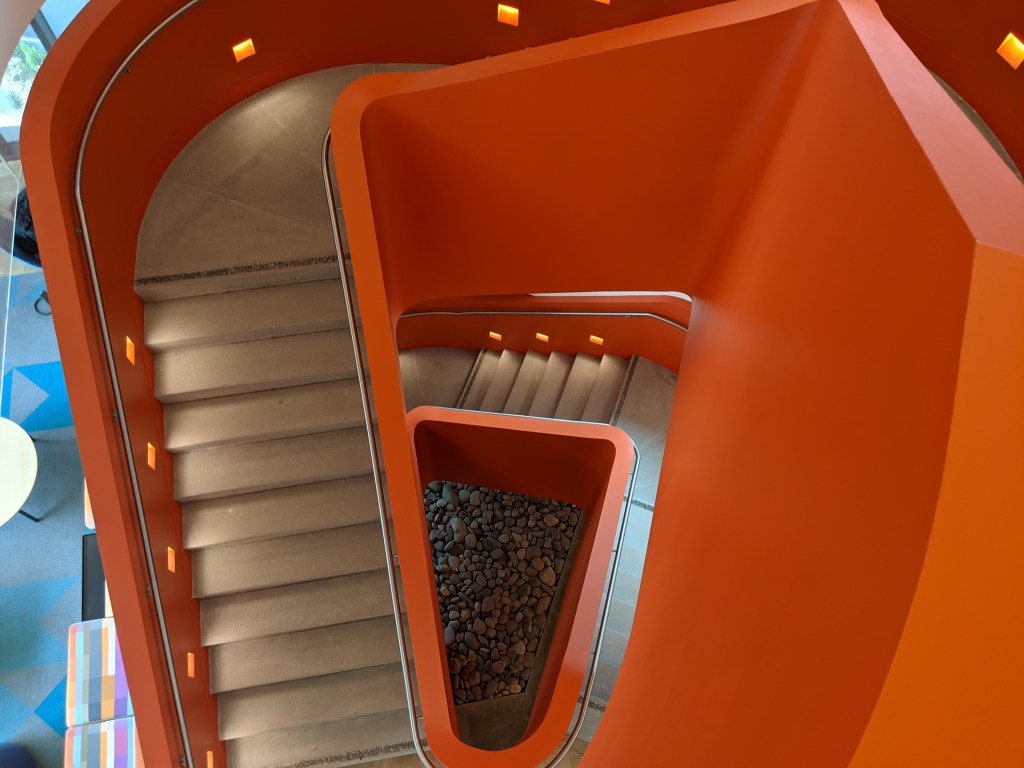 Further into the building, you’ll find a set of bright red stairs, which go down to the first floor and up to the third. If you’re looking for a CS professor, you’ll want to head up to the third floor, where their offices are located. Or, if you’re looking for a space to work on particularly tricky p-sets, there are two open study spaces with chairs and whiteboards there as well. On the third floor, you can also find a conference room and the Worster Research Lab. Two bridges cross over the courtyard for easy access between both sides of the building.